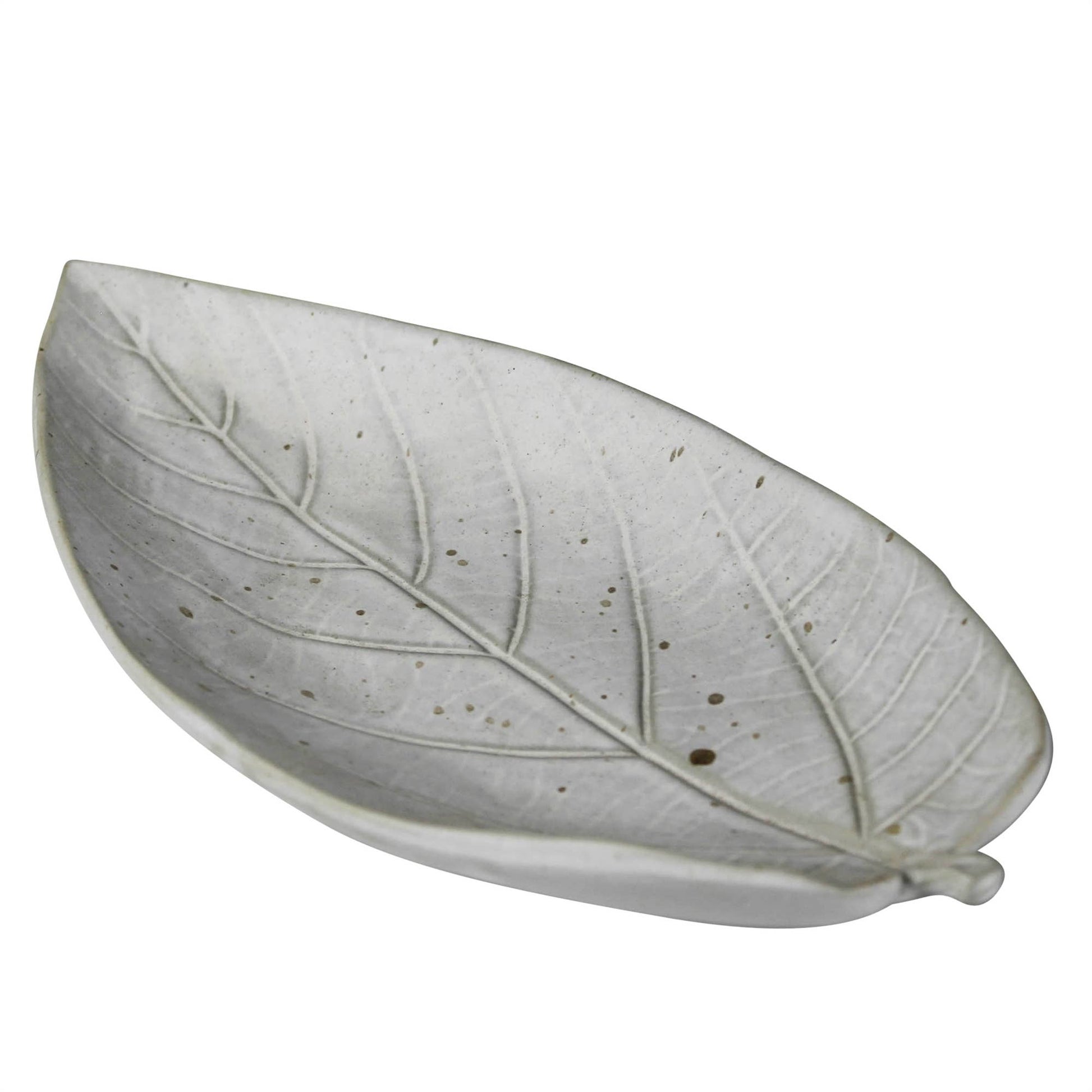 A matte white glaze with subtle specks adds further depth to the sculpted leaf shapes on this unique tray. Food safe.